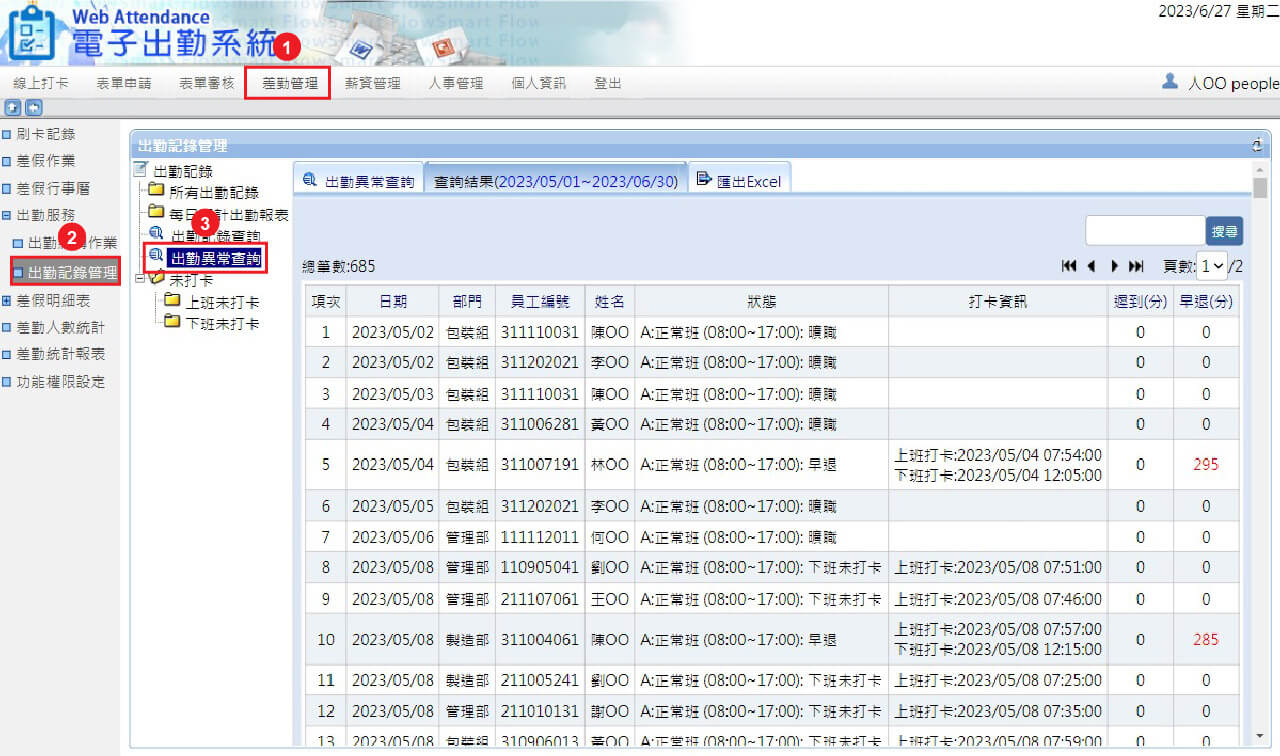 1.差勤管理 > 2.出勤記錄管理 > 3.出勤異常查詢